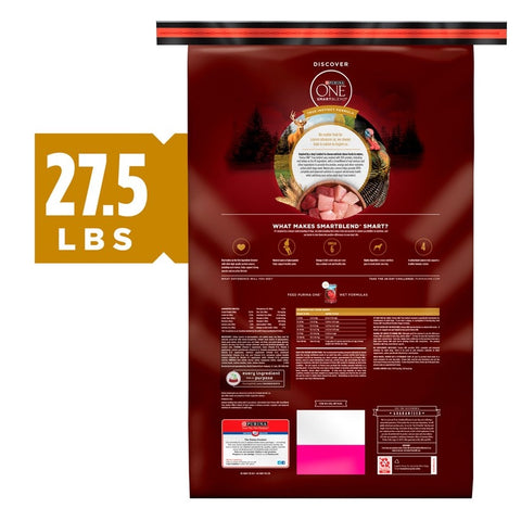Give your dog the nutrition he needs while satisfying his true instincts when you serve Purina ONE SmartBlend True Instinct With a Natural Blend Of Real Turkey & Venison adult dry dog food. This natural pet food plus vitamins and minerals features a blend of real turkey and venison and other high-quality ingredients to provide the protein active adult dogs need and the nutrient-dense nutrition dogs crave. Crunchy kibble and double the meaty morsels compared to our Purina ONE Lamb & Rice formula help to make mealtime even more enjoyable, and the highly-digestible formula lets more nutrition go to work inside your dog. Along with 30% protein in every serving, this dog food provides a natural source of glucosamine to help support your dog's healthy joints so he can maintain his active lifestyle. Nature plus science helps provide 100% complete and balanced nutrition to support an adult dog's whole-body health, giving you a smart solution for tending to your dog's nutritional needs.