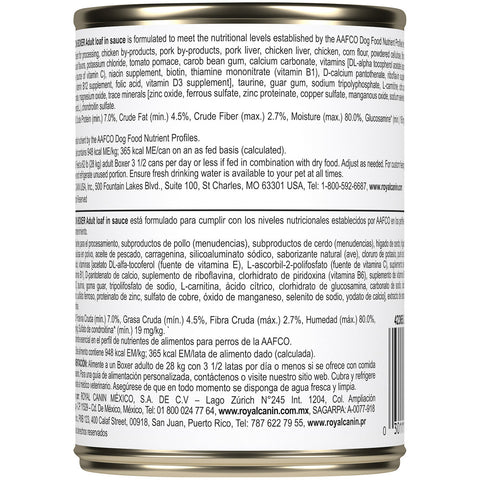 Royal Canin Boxer Loaf in Sauce wet dog food is tailor-made nutrition created just for your pure breed Boxer. Whether you have a fawn, brindle, or white purebred, this exclusive breed-specific diet is uniquely formulated for your Boxer, with the specific nutrients to help them thrive. The complete and balanced soft dog food features a smooth paté texture to appeal to your Boxer’s appetite. Precise protein content and L-carnitine support healthy muscles. And essential nutrients like taurine, EPA, and DHA help maintain heart health. Mix in or complement with Royal Canin Boxer dry dog food for a meal that’s sure to have them licking their chops.