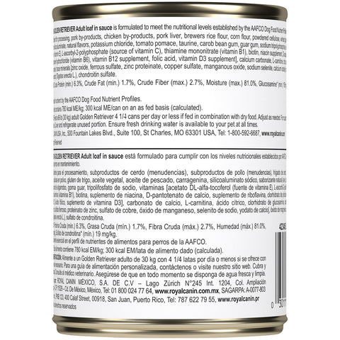 Complete and balanced canned dog food can be fed alone or mixed with Royal Canin Golden Retriever Adult dry dog food