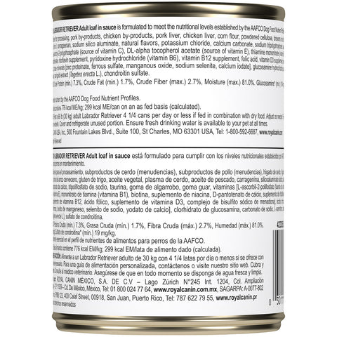 Complete and balanced canned dog food can be fed alone or mixed with Royal Canin Adult Labrador Retriever dry dog food