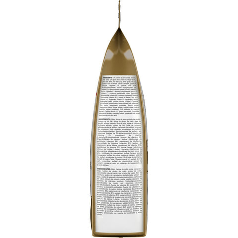 Corn, chicken by-product meal, brewers rice, wheat, corn gluten meal, chicken fat, natural flavors, pea fiber, dried plain beet pulp, wheat gluten, fish oil, sodium silico aluminate, calcium carbonate, potassium chloride, vegetable oil, psyllium seed husk, fructooligosaccharides, sodium tripolyphosphate, salt, vitamins [DL-alpha tocopherol acetate (source of vitamin E), niacin supplement, L-ascorbyl-2-polyphosphate (source of vitamin C), D-calcium pantothenate, biotin, pyridoxine hydrochloride (vitamin B6), riboflavin supplement, thiamine mononitrate (vitamin B1), vitamin A acetate, folic acid, vitamin B12 supplement, vitamin D3 supplement], taurine, hydrolyzed yeast, choline chloride, L-lysine, L-tyrosine, glucosamine hydrochloride, trace minerals [zinc proteinate, zinc oxide, manganese proteinate, ferrous sulfate, manganous oxide, copper sulfate, calcium iodate, sodium selenite, copper proteinate], GLA safflower oil, marigold extract (Tagetes erecta L.), green tea extract, L-carnitine, chondroitin sulfate, rosemary extract, preserved with mixed tocopherols and citric acid.