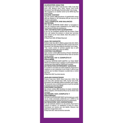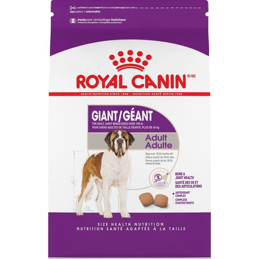 Royal Canin Giant Adult dry dog food is tailored to support your dog’s commanding presence and lifestyle. This giant-breed formula contains glucosamine, chondroitin, and EPA/DHA to help keep bones and joints healthy and strong. An exclusive complex of antioxidants supports cellular health. Heart-healthy nutrients like taurine help keep big hearts healthy. High-quality proteins and a blend of fermentable and non-fermentable fibers help support optimal digestive health. Plus, the extra-large kibble encourages chewing, so big dogs can properly digest their food. Add some variety to their bowl with Royal Canin Adult wet dog food.