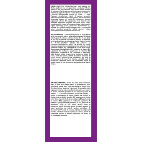 Chicken by-product meal, brewers rice, chicken fat, brown rice, corn gluten meal, wheat, natural flavors, dried plain beet pulp, pea fiber, wheat gluten, fish oil, vegetable oil, potassium chloride, calcium carbonate, salt, choline chloride, vitamins [DL-alpha tocopherol acetate (source of vitamin E), L-ascorbyl-2-polyphosphate (source of vitamin C), biotin, D-calcium pantothenate, vitamin A acetate, pyridoxine hydrochloride (vitamin B6), niacin supplement, folic acid, thiamine mononitrate (vitamin B1), vitamin B12 supplement, riboflavin supplement, vitamin D3 supplement], trace minerals [zinc proteinate, manganese proteinate, zinc oxide, ferrous sulfate, manganous oxide, copper sulfate, calcium iodate, sodium selenite, copper proteinate], taurine, glucosamine hydrochloride, GLA safflower oil, marigold extract (Tagetes erecta L.), magnesium oxide, L-carnitine, chondroitin sulfate, rosemary extract, preserved with mixed tocopherols and citric acid.Guaranteed Analysis