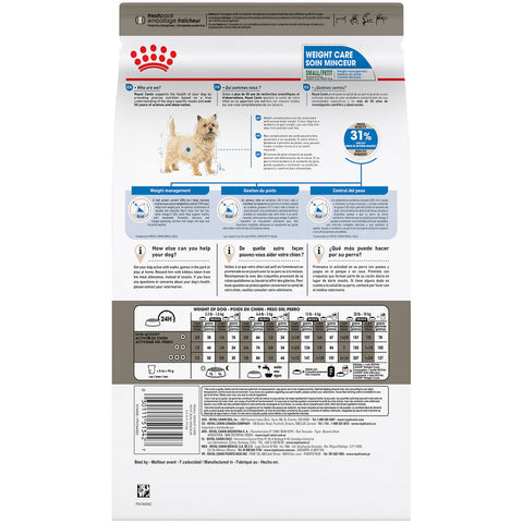 Royal Canin Small Weight Care dry dog food (formerly Mini Weight Care) is tailored nutrition to help your small adult dog maintain a healthy weight. This weight control formula contains a precise combination of soluble and insoluble fibers to help small breed dogs feel full in between meals. High protein helps maintain muscle mass. Omega-3 fatty acids support healthy joint movement. And to help limit weight gain, this high protein diet contains 31% less fat than Royal Canin Small Adult. Remember, regular exercise like walks and playtime will also help your dog maintain an ideal weight. Be sure to consult your veterinarian to know what level of activity is appropriate for your pet to achieve a healthy weight.