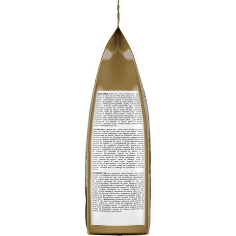 Brewers rice, chicken by-product meal, corn, chicken fat, brown rice, pork meal, wheat, natural flavors, dried chicory root, vegetable oil, fish oil, sodium silico aluminate, potassium chloride, calcium carbonate, flaxseed, salt, fructooligosaccharides, sodium tripolyphosphate, vitamins [DL-alpha tocopherol acetate (source of vitamin E), niacin supplement, L-ascorbyl-2-polyphosphate (source of vitamin C), D-calcium pantothenate, biotin, pyridoxine hydrochloride (vitamin B6), riboflavin supplement, thiamine mononitrate (vitamin B1), vitamin A acetate, folic acid, vitamin B12 supplement, vitamin D3 supplement, menadione sodium bisulfite complex], DL-methionine, choline chloride, L-lysine, monocalcium phosphate, trace minerals [zinc proteinate, ferrous sulfate, zinc oxide, manganous oxide, copper sulfate, sodium selenite, calcium iodate], magnesium oxide, marigold extract (Tagetes erecta L.), glucosamine hydrochloride, GLA safflower oil, taurine, green tea extract, L-carnitine, chondroitin sulfate, rosemary extract, preserved with mixed tocopherols and citric acid.
