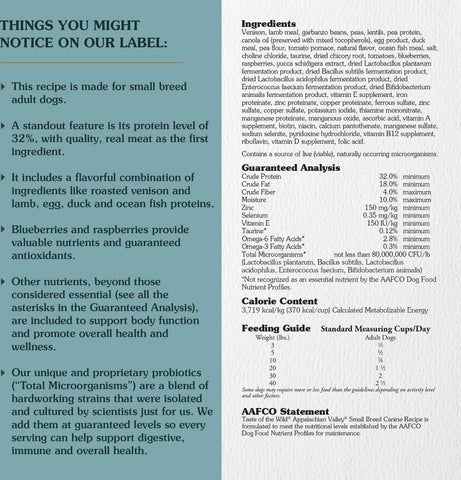 Highly digestible venison and small kibble size make this recipe easy on your small breed dog’s tummy and teeth. Probiotics and prebiotic fiber help support healthy digestion, while roasted venison along with lamb, egg, duck and ocean fish proteins provide recommended amino acid nutrition. Rich in protein and fat, this recipe provides the energy that active small dogs need.