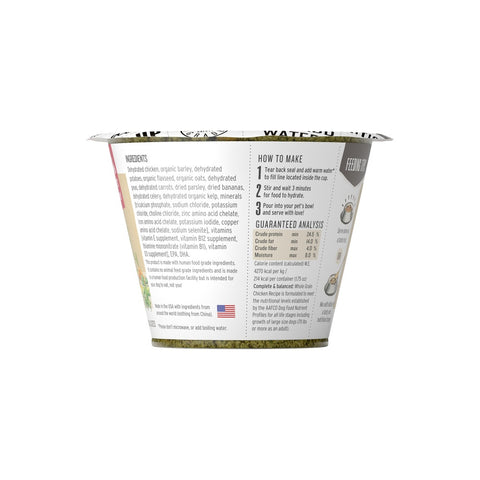 Dehydrated chicken, organic barley, dehydrated potatoes, organic flaxseed, organic oats, dehydrated peas, dehydrated carrots, dried parsley, dried bananas, dehydrated celery, dehydrated organic kelp, minerals [tricalcium phosphate, sodium chloride, potassium chloride, choline chloride, zinc amino acid chelate, iron amino acid chelate, potassium iodide, copper amino acid chelate, sodium selenite], taurine, vitamins [vitamin E supplement, vitamin B12 supplement, thiamine mononitrate (vitamin B1), D- calcium pantothenate (vitamin B5), riboflavin (vitamin B2), vitamin D3 supplement], EPA, DHA.