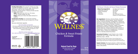 Wellness Complete Health Natural Chicken and Sweet Potato Recipe Wet Canned Dog Food is all natural and full of protein from natural Chicken. This recipe includes Sweet Potatoes making it an easily-digested formula that can be used as a stand alone meal or as a tasty dry food topper for an extra-special treat. Wellness includes biotin in this canned recipe to enhance your dogs coat, keep the skin nice and clear, and is full of immune system boosting antioxidants.