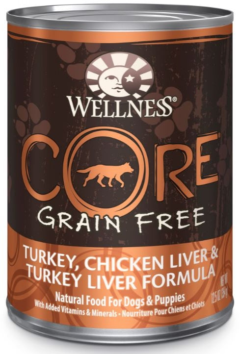 Wellness CORE Grain-free Natural Turkey, Chicken and Turkey Liver Recipe Wet Canned Dog Food is rich in protein, free of grains and is supplemented with salmon oil and cranberries to help support your dogs inner health. If you've been looking for a great and healthy canned food give this one a try! Your dog is sure to love it.