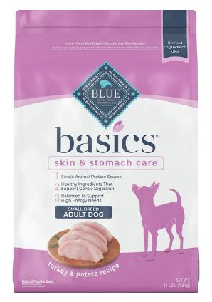 - LIMITED INGREDIENT SMALL BREED DOG FOOD: BLUE Basics is a limited ingredient dog food that doesn’t contain any chicken, beef, corn, wheat, soy, dairy or eggs making it a good option for dogs with food sensitivities. Plus, it features small-bite kibble and is specifically formulated with a balance of carbohydrates and protein to help meet the unique energy needs of small breed dogs.