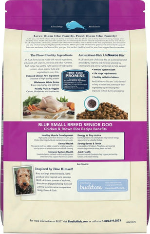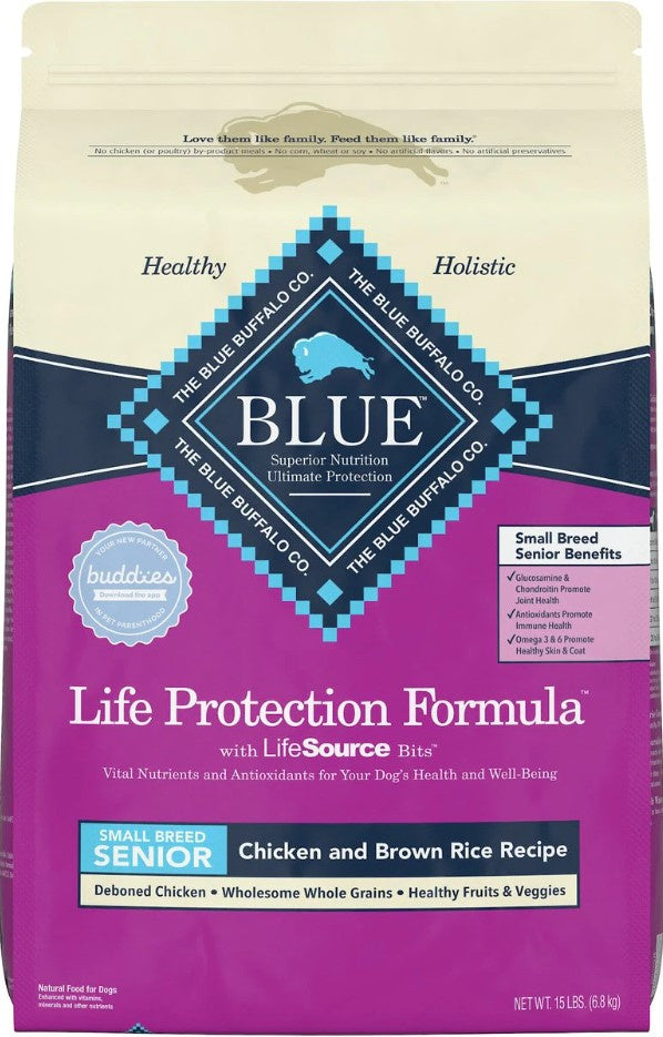 • FOR SMALL BREED SENIOR DOGS: BLUE Life Protection Formula® Small Breed Senior Dog Food contains glucosamine and chondroitin to help support joint health and overall mobility with the essential proteins and carbohydrates to help maintain energy requirements for a healthy lifestyle with a kibble size ideal for smaller jaws.