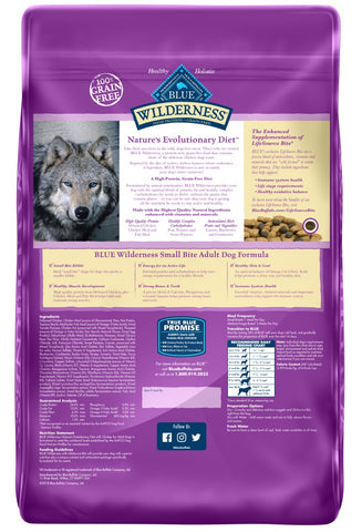 - GRAIN FREE SMALL BITE FOOD: BLUE Wilderness grain free small bite dog food is made for dogs who prefer a smaller kibble. Plus, it contains omega 3 & 6 fatty acids to support skin and coat health.