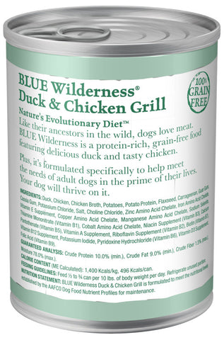Packed with more of the meat dogs love and free of the grains that contain gluten, BLUE Wilderness wet dog food is made to feed your dog’s wild side. With real duck and chicken, plus fruits and vegetables, this grain free recipe features the finest natural ingredients enhanced with vitamins and minerals.