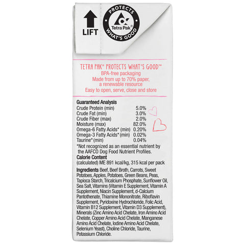 Beef, Beef Broth, Carrots, Sweet Potatoes, Apples, Potatoes, Green Beans, Peas, Tapioca Starch, Tricalcium Phosphate, Sunflower Oil, Salt, Vitamins (Vitamin E Supplement, Vitamin A Supplement, Niacin Supplement, d-Calcium Pantothenate, Thiamine Mononitrate, Riboflavin Supplement, Pyridoxine Hydrochloride, Folic Acid, Vitamin B12 Supplement, Vitamin D3 Supplement), Minerals (Zinc Amino Acid Chelate, Iron Amino Acid Chelate, Copper Amino Acid Chelate, Manganese Amino Acid Chelate, Iodine Amino Acid Chelate, Selenium Yeast), Choline Chloride, Taurine, Potassium Chloride