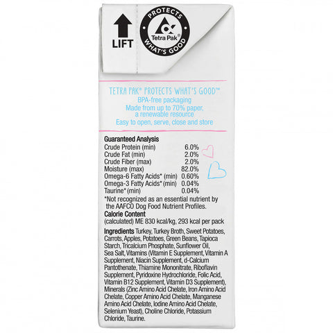 Turkey, Turkey Broth, Sweet Potatoes, Carrots, Apples, Potatoes, Green Beans, Tapioca Starch, Tricalcium Phosphate, Sunflower Oil, Salt, Vitamins (Vitamin E Supplement, Vitamin A Supplement, Niacin Supplement, d-Calcium Pantothenate, Thiamine Mononitrate, Riboflavin Supplement, Pyridoxine Hydrochloride, Folic Acid, Vitamin B12 Supplement, Vitamin D3 Supplement), Minerals (Zinc Amino Acid Chelate, Iron Amino Acid Chelate, Copper Amino Acid Chelate, Manganese Amino Acid Chelate, Iodine Amino Acid Chelate, Selenium Yeast), Choline Chloride, Potassium Chloride, TaurineGuaranteed Analysis