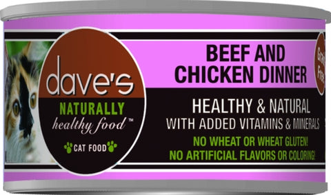 Dave's Naturally Healthy Beef & Chicken Dinner is a Premium Grain-Free Cat Food. This cat food has added vitamins and minerals with no wheat, gluten, artificial flavors or colors.