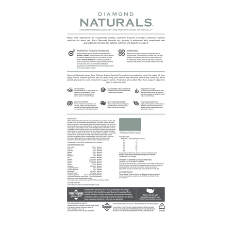 Diamond Naturals Senior Dog is formulated to meet the needs of your aging friend. Optimal protein and fat levels help your senior dog maintain ideal body condition, while added glucosamine and chondroitin support joints. Probiotics and added fiber help support digestion even in sensitive pets.