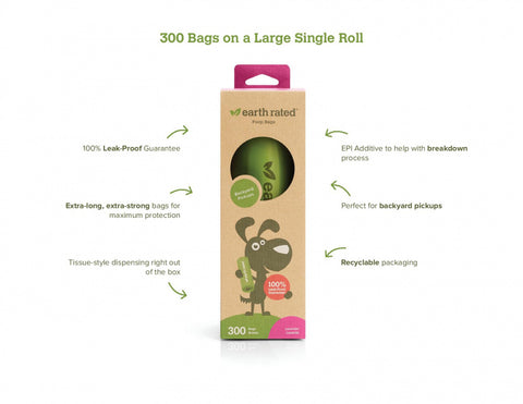 For pet owners who love Earth Rated® bags but prefer a fragrance-free option, this 300-count value-pack is conveniently packaged on a single roll in a box made from recycled content that dispenses one bag at a time. Unscented, leak-proof and extra strong, they can hold any size poop and fit perfectly in your pantry. Earth Rated® products are the industry leader in terms of quality, and most of all, affordability. At Earth Rated®, we don't leave out the littlest of details - even our rolls' cores and packaging are made from recycled content!