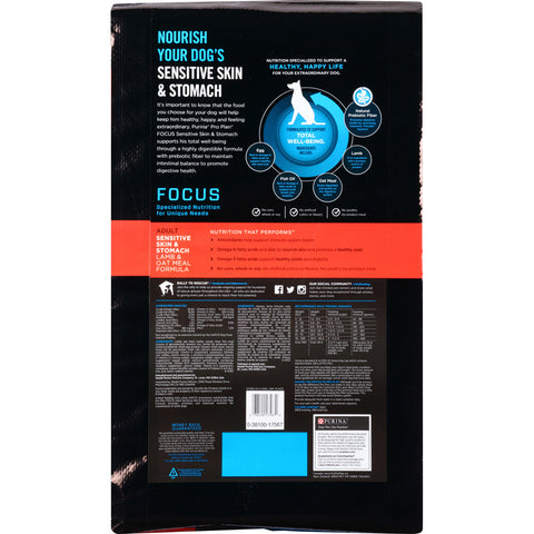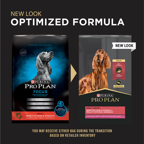 Care for your dog's sensitive skin and stomach while still tending to his nutritional needs with Purina Pro Plan Sensitive Skin & Stomach Lamb & Oat Meal Formula adult dry dog food. This recipe is made without corn, wheat, soy or poultry by-product meal, giving your canine companion wholesome ingredients you expect from a super-premium dog food. Omega-6 fatty acids and zinc in every serving help to nourish your dog's skin and promote his healthy coat, so he can look his very best, and omega-3 fatty acids help to support his healthy joints and mobility for an active lifestyle. With high-quality ingredients chosen for a specific nutritional or functional purpose, this dry dog food recipe delivers outstanding nutrition to your best buddy's bowl every day. Make Purina Pro Plan part of his regular diet, and show him just how important his overall health and wellness are to you.