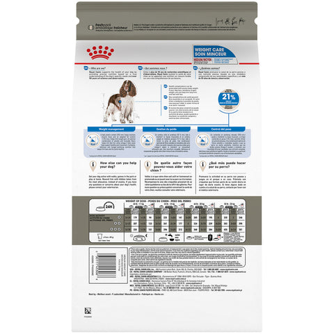Royal Canin Medium Weight Care dry dog food is tailored nutrition to help your medium adult dog maintain a healthy weight. This weight control formula contains a precise combination of soluble and insoluble fibers to help medium sized dogs feel full. High protein helps maintain muscle mass. Omega-3 fatty acids support healthy joint movement. And to help limit weight gain, this high protein diet contains 21% less fat than Royal Canin Medium Adult. Remember, regular exercise like walks and playtime will also help your dog maintain an ideal weight. Be sure to consult your veterinarian to know what level of activity is appropriate for your pet to achieve a healthy weight.