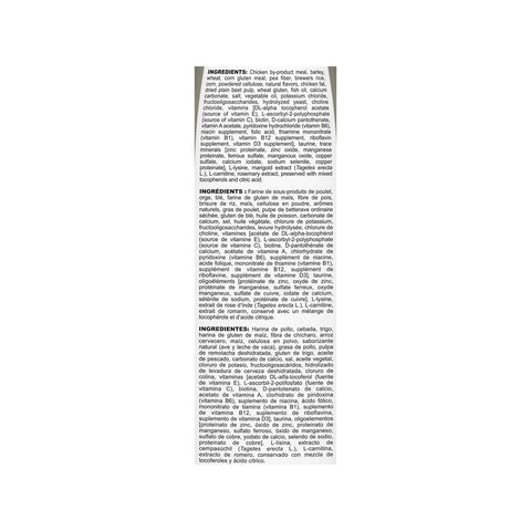 Chicken by-product meal, barley, wheat, corn gluten meal, pea fiber, brewers rice, corn, powdered cellulose, natural flavors, chicken fat, dried plain beet pulp, wheat gluten, fish oil, calcium carbonate, salt, vegetable oil, potassium chloride, fructooligosaccharides, hydrolyzed yeast, choline chloride, vitamins [DL-alpha tocopherol acetate (source of vitamin E), L-ascorbyl-2-polyphosphate (source of vitamin C), biotin, D-calcium pantothenate, vitamin A acetate, pyridoxine hydrochloride (vitamin B6), niacin supplement, folic acid, thiamine mononitrate (vitamin B1), vitamin B12 supplement, riboflavin supplement, vitamin D3 supplement], taurine, trace minerals [zinc proteinate, zinc oxide, manganese proteinate, ferrous sulfate, manganous oxide, copper sulfate, calcium iodate, sodium selenite, copper proteinate], L-lysine, marigold extract (Tagetes erecta L.), L-carnitine, rosemary extract, preserved with mixed tocopherols and citric acid.
