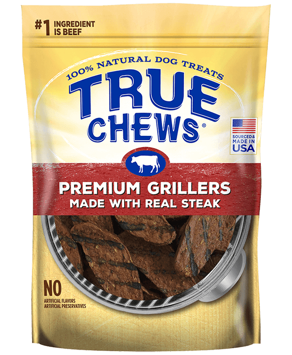 Made in the USA with real American, USA-sourced chicken, these 100% natural dog treats are the perfect everyday treat for your everyday amazing dog. True Chews® Premium Grillers Dog Treats contain no corn, wheat or soy, no animal by-products, no artificial flavors or artificial preservatives.