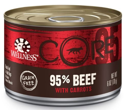Wellness Natural Grain Free 95% Beef and Carrots Recipe Adult Wet Canned Dog is packed with human grade, all natural, deboned chicken. This is a great way to complement your dogs dry kibble and a great way of keeping them hydrated. Wellness Natural Grain Free 95% Beef and Carrots Recipe contains no meat by-products, grains, fillers, artificial preservatives, artificial colors or artificial flavors and makes for a protein rich mixer or topper your dog is sure to love. Feel free to feed this recipe occasionally as a super premium protein-rich meal for your spoiled dog.
