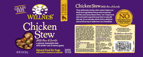 Wellness Chicken Stew with Peas & Carrots Canned Dog Food is formulated with thick chunks of meat in a hearty gravy dogs love, and it's made with wholesome, healthy, natural ingredients like Chicken, Carrots, and Peas. This everyday entree is a delicious and nutritious way to make more out of mealtime. Your dog will love this protein-packed food and rest assured, because all the Wellness recipes have no wheat, corn, soy, artificial colors, or preservatives.