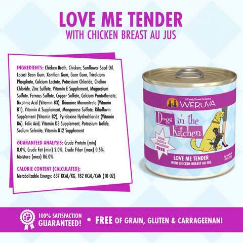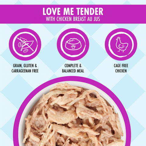 In this meal, the tender pieces of shredded chicken in a tasty, high-moisture au jus will leave your doggo wanting more!