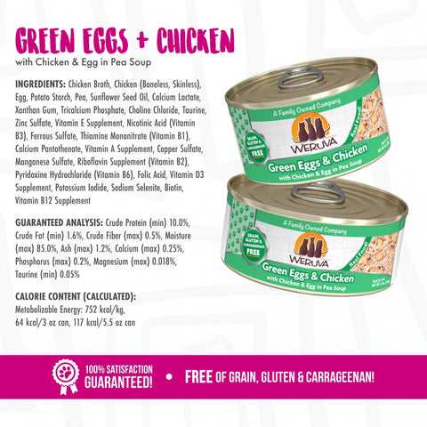 Weruva Green Eggs And Chicken Formula Canned Cat Food is full of boneless, skinless, and cage-free white breast chicken and fresh peas in gravy for your little carnivore. Weruva always guarantees their chicken is free of added antibiotics and hormones for a healthy kitty. Weruva Green Eggs And Chicken Formula Canned Cat Food is free of grains, GMOs, MSG, and carrageens a guaranteed balanced meal with each can. Not to be mistaken with Dr. Seuss' green eggs and ham.