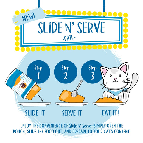 Slide N’ Serve™ Paté in a pouch! - We’re making it easier and more fun to feed our feline friends their favorite foods. Simply open the pouch, slide the food out, and prepare to your cat’s content. (And don’t forget to recycle the pouch!)