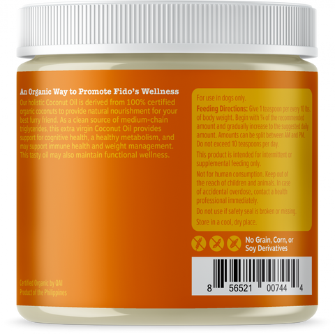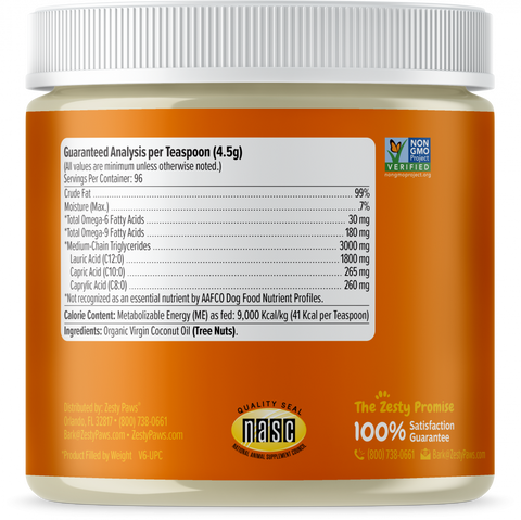100% CERTIFIED ORGANIC - Zesty Paws Coconut Oil is a extra virgin superfood made from 100% Certified Organic coconuts that can be consumed for internal benefits or used on the skin to keep your pet feeling healthy and happy.