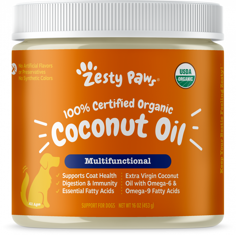 Zesty Paws® Coconut Oil is a super-food supplement derived from 100% Certified Organic coconuts to provide natural nourishment for your four-legged friend. As a clean source of medium-chain triglycerides (fatty acids), this extra virgin Coconut Oil supports skin and coat health, along with cognitive, digestive, and immune system function to help your dog feel as healthy as can be.